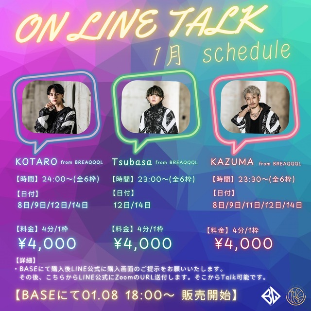 ON LINE 1ON1 TALK 〜BREAQQQL MEMBERと寝る前に話せちゃう!?〜 1月SCHEDULE(前半) Tsubasa from BREAQQQL 【料金】4分/1枠 ¥4,000 【時間】23:00〜(全6枠) 【日付】12日/14日 KAZUMA from BREAQQQL 【料金】4分/1枠 ¥4,000 【時間】23:30〜(全6枠) 【日付】8日/9日/11日/12日/14日 KOTARO from BREAQQQL 【料金】4分/1枠 ¥4,000 【時間】24:00〜(全6枠) 【日付】8日/9日/12日/14日 * zoomにて * 購入後LINE公式にて 1. 購入画面提示 2. こちらからLINE公式にZoomのURL送付 【BASEにて 01.08 18:00〜販売開始】